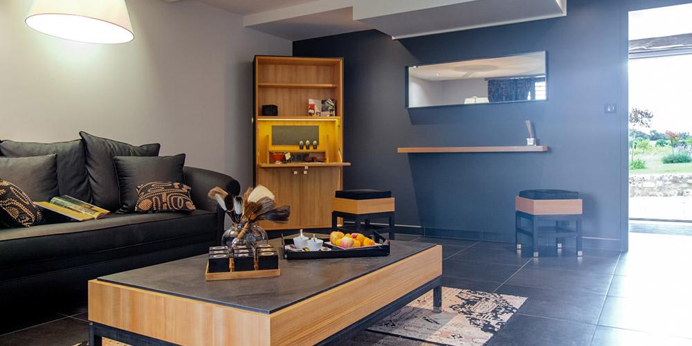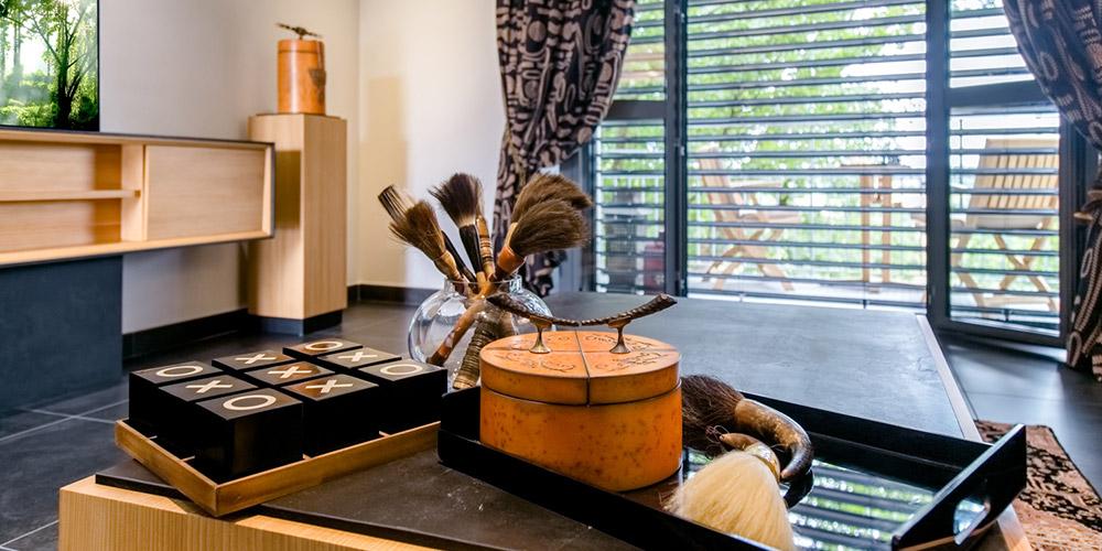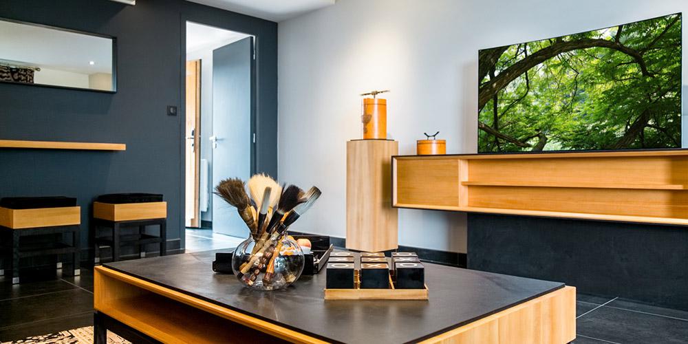Decorated with Cedar of Lebanon and slate, this suite offers guests a spacious private entrance, separate living room and bedroom, luxurious rugs and custom fabrics.