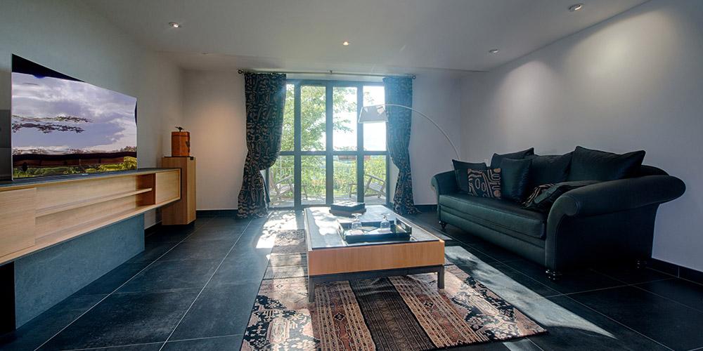 - on the lower level : entrance, toilets, living room with sofa, working desk, private tanning balcony with comfortable seating area,